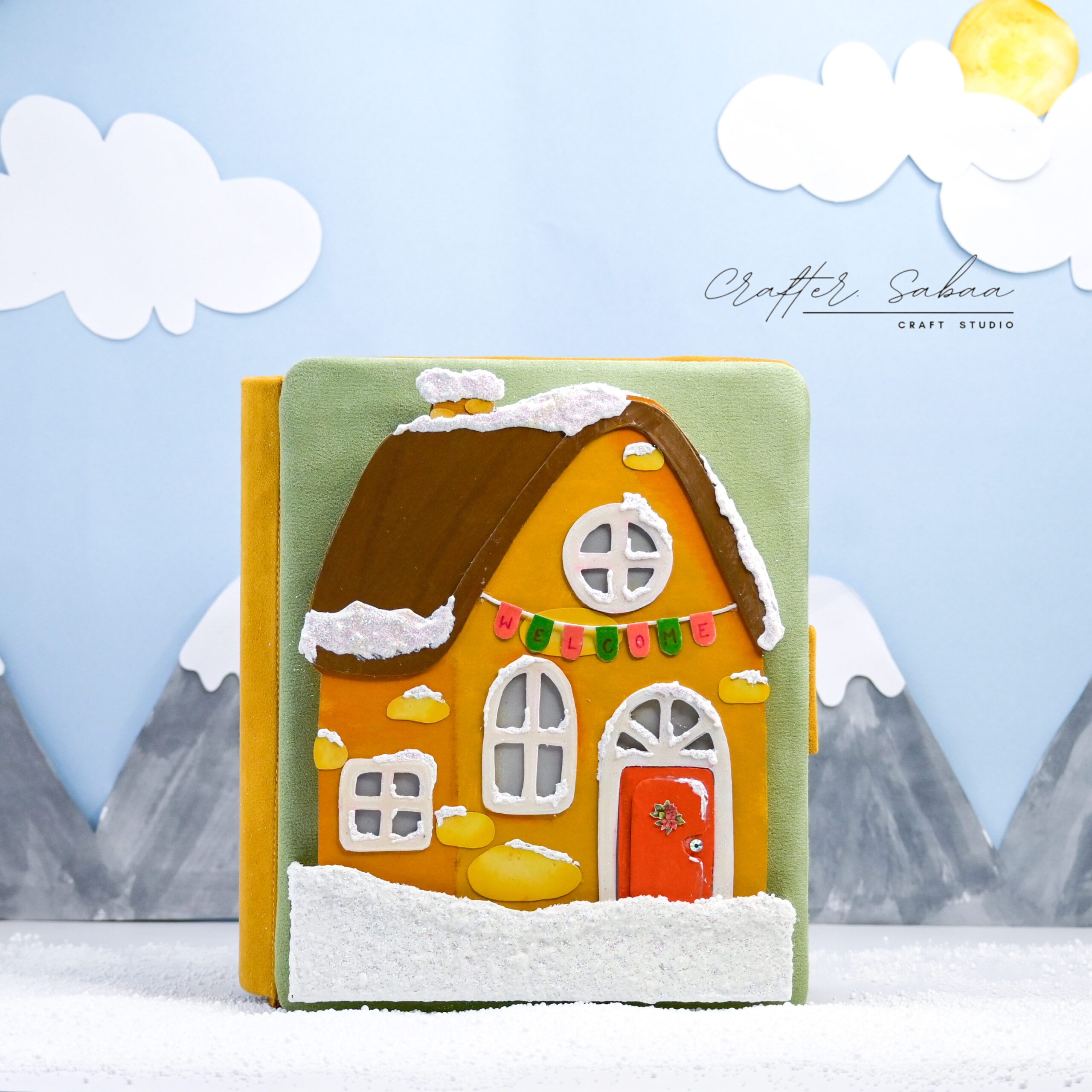 The top section features a beautiful handmade 3D house, decorated with snow textures, windows, and a festive welcome banner. You will also learn how to add a light setup inside the cover, transforming your album into a stunning decorative piece.